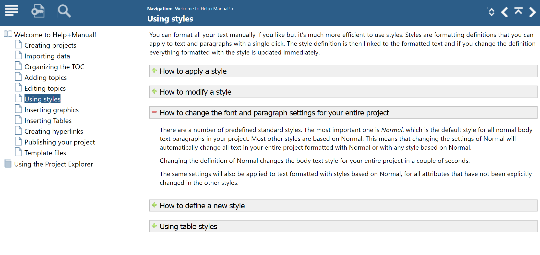 Die folgende Abbildung zeigt ein Beispiel einer mit Help+Manual generierten WebHelp unter Verwendung einer der mitgelieferten Skins ohne Anpassung: